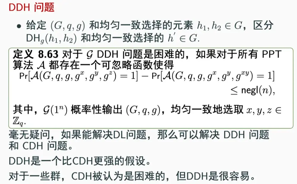 CDH 问题定义 DHg(h1,h2)=gindgh1⋅indgh2 如果对于任意的 PPT 敌手 A,知道 G,q,g,h1,h2 的情况下,计算 DHg(h1,h2) 都是困难的,即: Pr[A(G,q,g,gx,gy)=gxy]≤negl(n) 则称 CDH 和 G 相关是困难的指向原始笔记的链接
