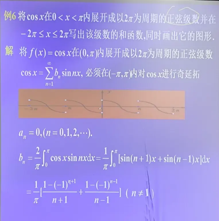 如果 f 定义在 [0,π] 上,把 f 延拓成以 2π 为周期的函数 F(x),即奇延拓和偶延拓 奇延拓要翻转,偶延拓直接翻折就行 再做周期延拓 求级数结果限定在基本区间上 求系数的时候被积函数都变成偶函数了,只用算半边 x2 就行 注意到 n+1 作为分母,排除了 n=1 的情况,需要单独拿出来积分