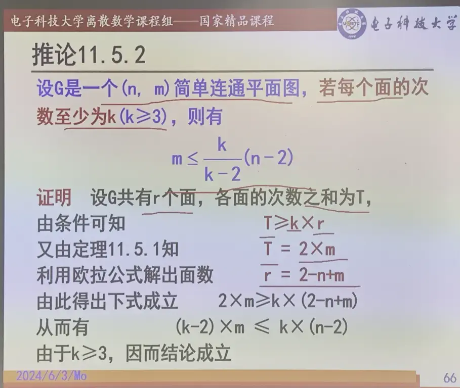 设 G 为一个简单连通平面图,有 n 个结点,m 条边,每个面的次数至少为 k,则有