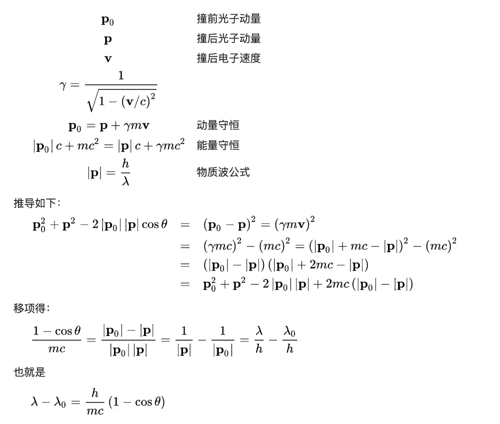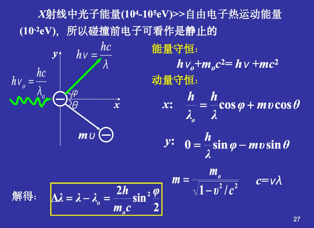 - 光子和外层电子碰撞(束缚弱),可以看成光子和自由电子碰撞,光子能量减少,频率减小,波长变大。原子量小的物质,电子受到原子束缚越小,康普顿效应越显著