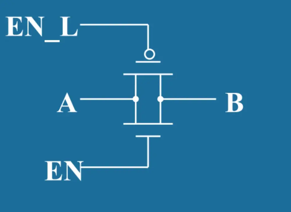 当 EN = 0,EN_L = 1,晶体管截止, A、B 断开 当 EN = 1,EN_L = 0,晶体管导通, A、B 之间低阻抗连接