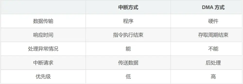 - 中断除了能完成外设和主机的数据交换,还能处理异常事件;而 DMA 方式下不能处理异常事件。