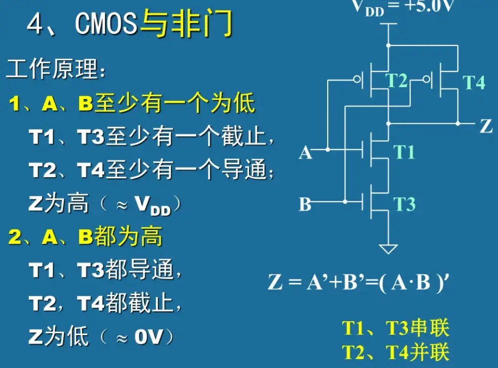如果两个都为高电平,上面都截止,下面都联通,输出低电平