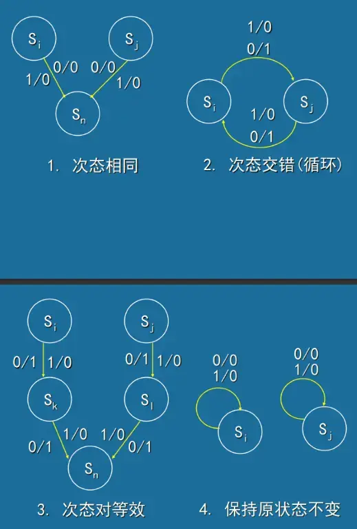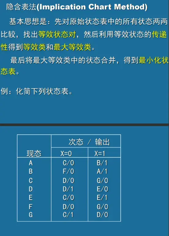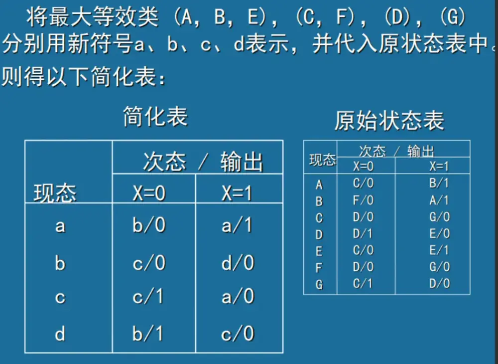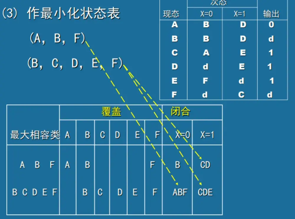 - 闭合性。即所选相容类集合中的任一相容类,在原始状态表中任一输入条件下产生的次态应该属于该集合中的某一相容类(不会跨相容类)