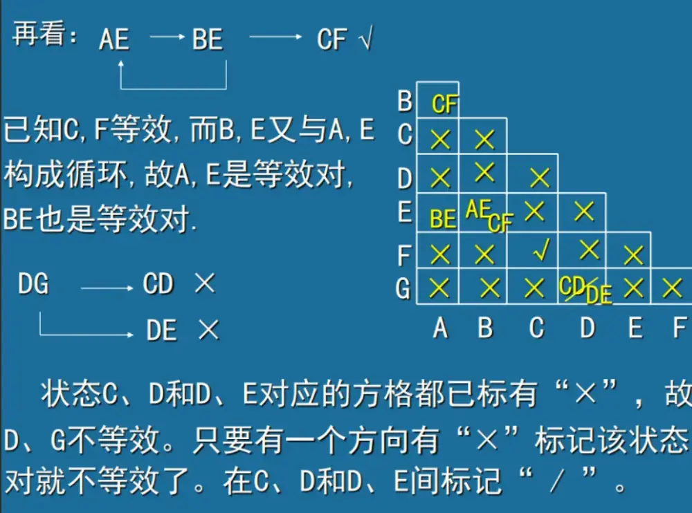 若方格内的次态对均为等效状态对,则该方格对 应的状态为等效状态。该方格不增加任何标志。 例如:AB 对应的方格中次态为 CF,而 CF 有 “√” 表明 CF 等效,故判定 AB 等效