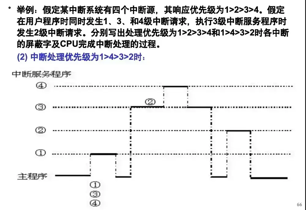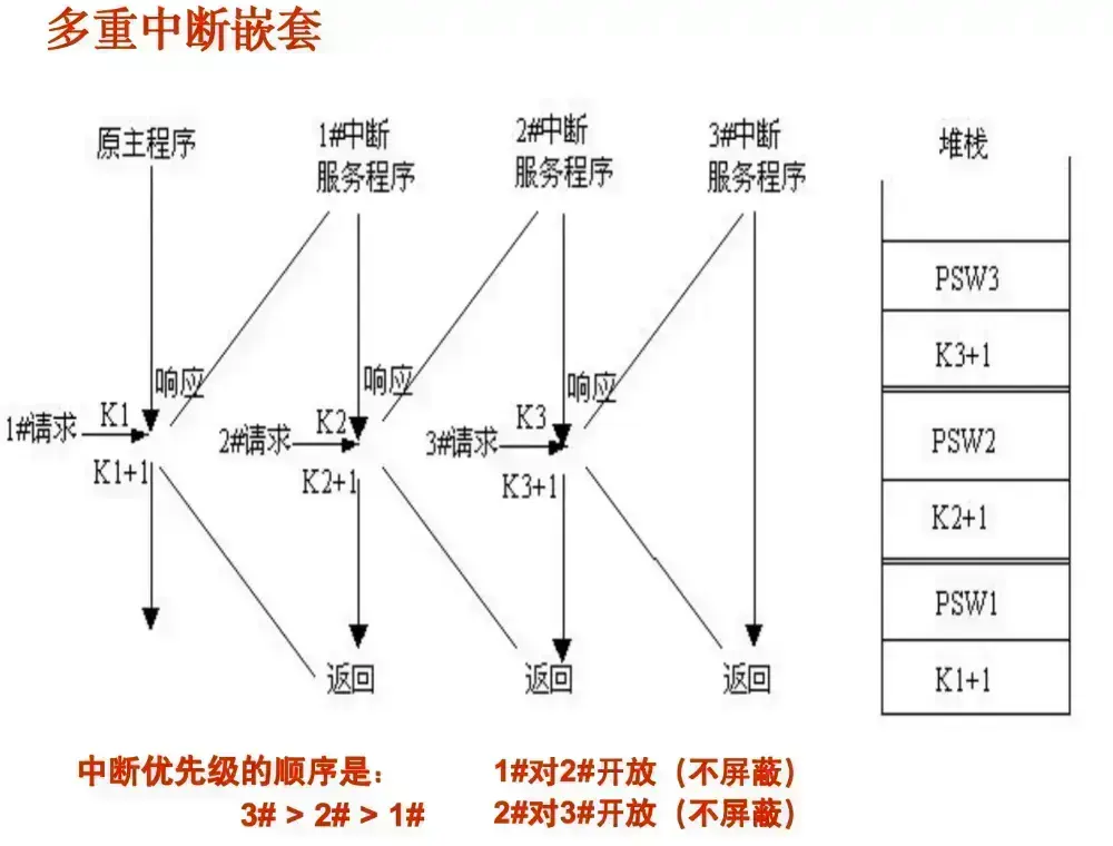 在一个中断处理(即执行中断服务程序)过程中,若又有新的中断请求发生,而新中断优先级高于正在执行的中断,则应立即中止正在执行的中断服务程序,转去处理新的中断。这种情况为多重中断,也称中断嵌套。