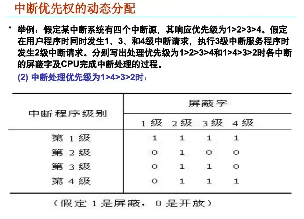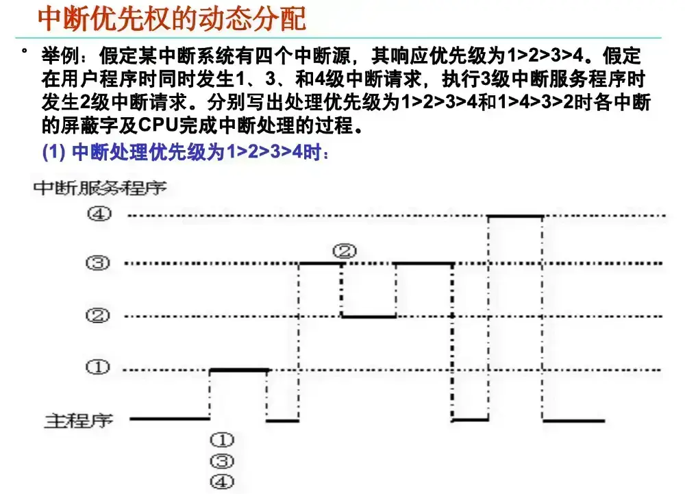 中断优先级的概念: 中断响应优先级 ---- 由查询程序或硬联排队线路决定的优先权,反映多个中断同时请求时选择哪个响应。( 8259 不可更改) 中断处理优先级 ---- 由各自的中断屏蔽字来动态设定,反映本中断与其它中断间的关系。(可以软件更改)