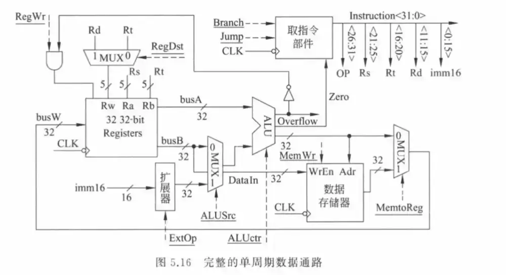 - 操作元件:操作元件是执行指令操作的硬件部件,如 ALU 和寄存器。状态单元用来存储处理器当前的状态,如通用寄存器,PC 等