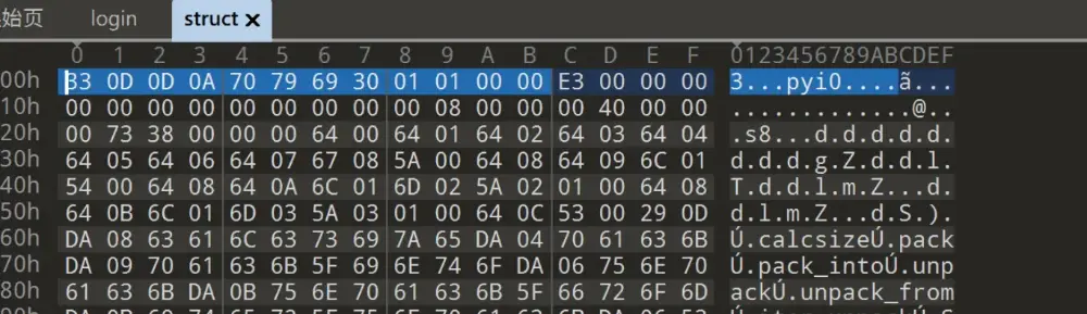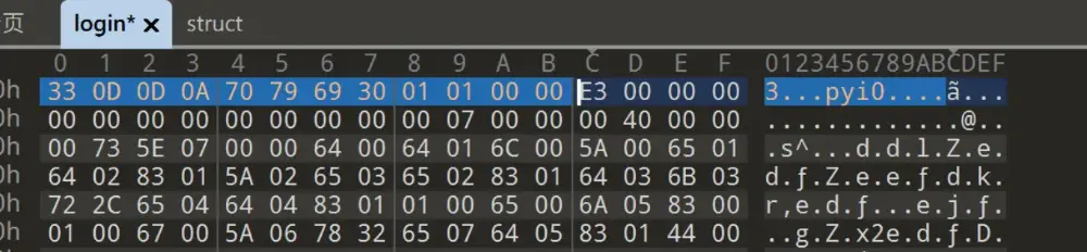 学习 pyc文件结构 得到 login 文件里那个 E3 估计是 TypeCode,前面的 Head 丢失了,需要从 struct 里面复制过去