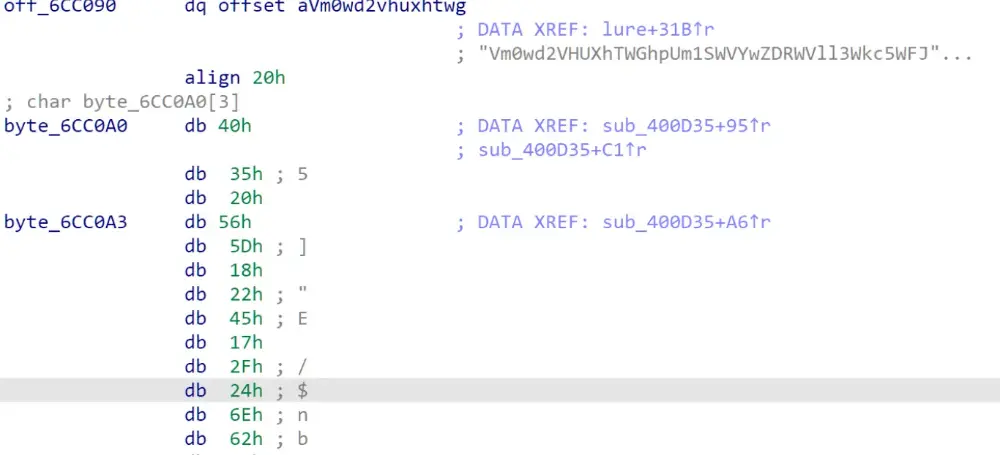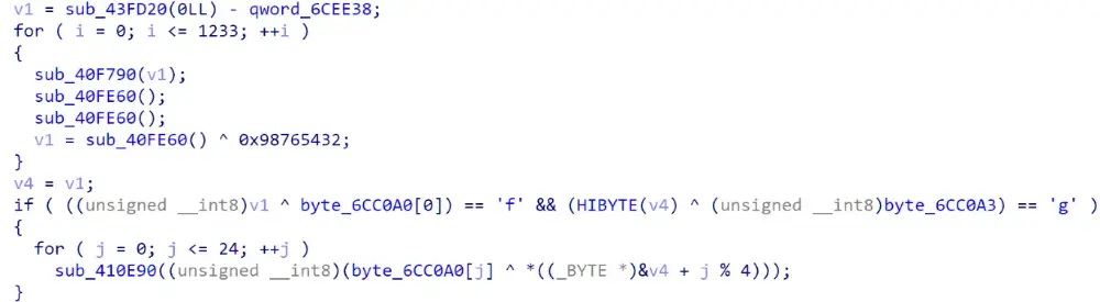 看到关键部分也就是中间的那个 if 部分,if 判断内将 byte_6CC0A0 数组的第一位与 key 的第一位异或,将 byte_6CC0A0 数组的第四位(也就是 byte_6CC0A3)与 key 的第四位异或(因为 HIBYTE() 函数的作用是获取高字节也就是数组的最后一位),并将两者的异或后的结果与 “f” 与 “g” 作比较,所以可以推理出 v4 其实是一个长度为 4 的数组,也就是 key,它按照一定的规律与 byte_6CC0A0 数组中的每一位异或最后生成一串开头为 flag 的字符串