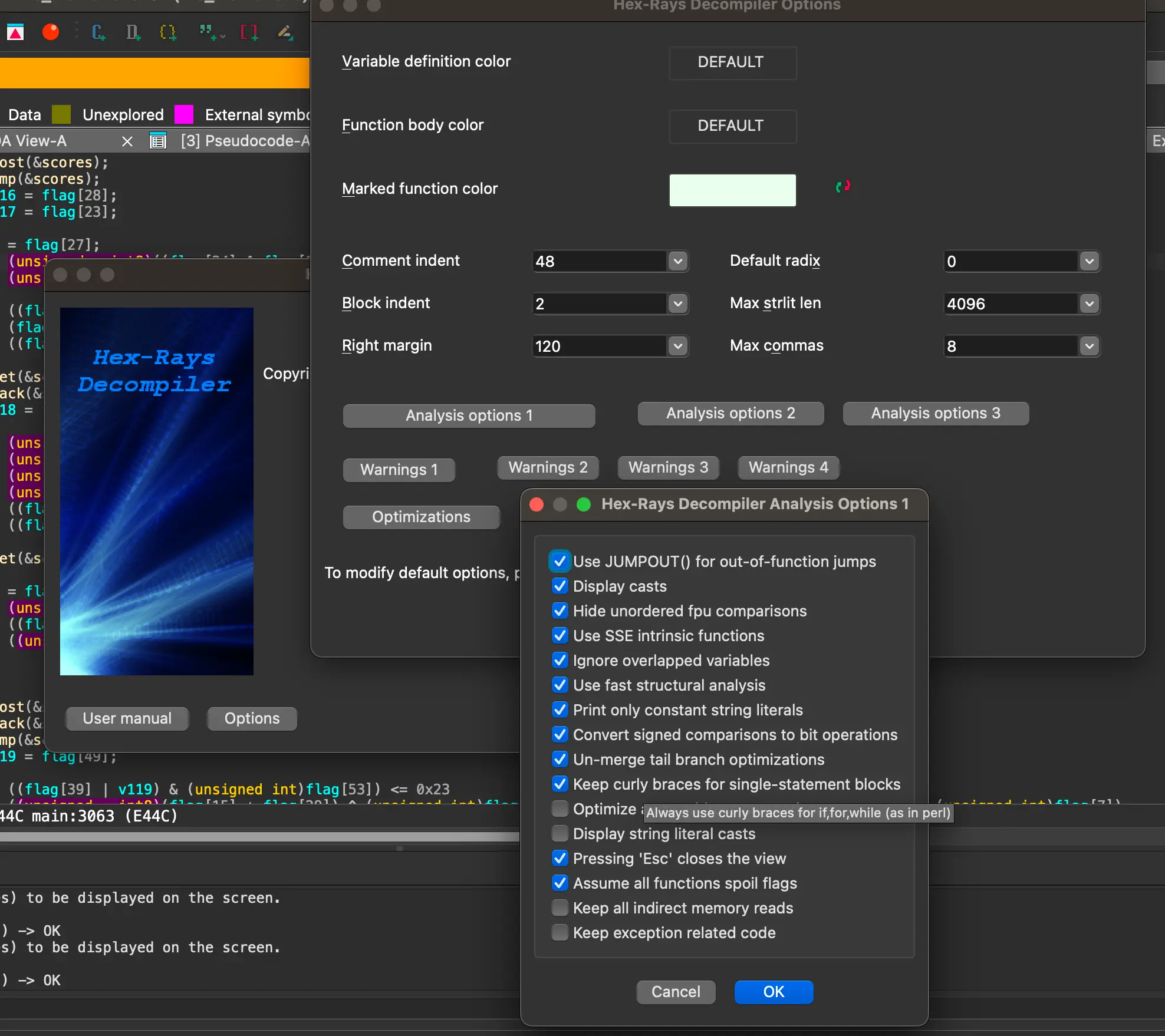在反汇编插件设置里面把单行大括号打开,便于正则匹配。设置 flag 类型为 unsigned __int8 然后拖出来。在上面的设置里面也可以看到有个选项 use fast structual 把嵌套的 if 给优化成 and 连接的形式了,这个给后边脚本编写也提供了遍历(看了一圈 bn 发现不会用,还是回来调 ida 了)