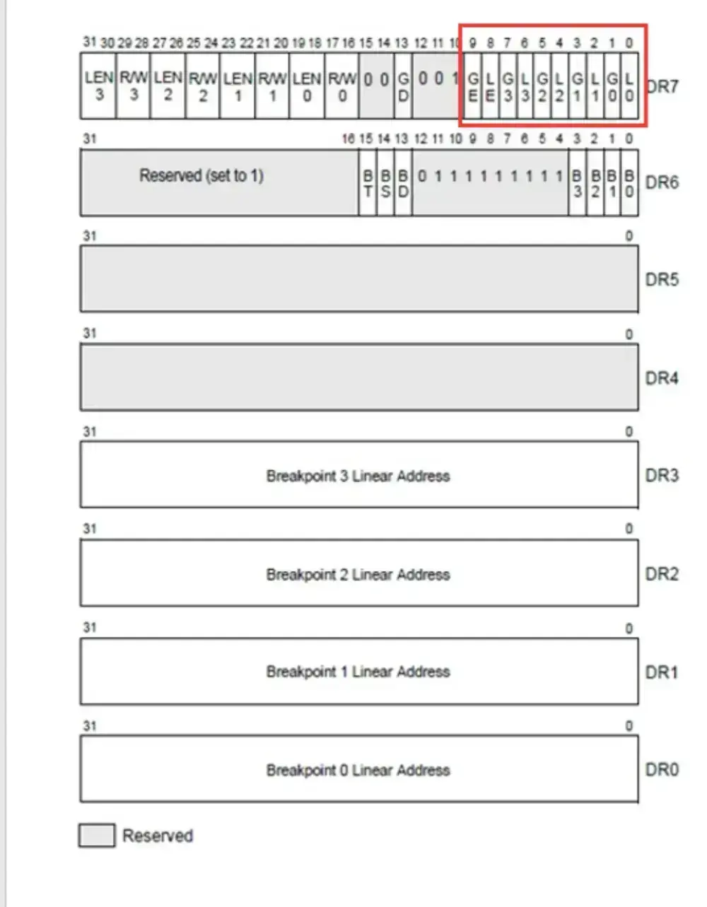 L0/G0 ~ L3/G3:控制 Dr0~Dr3 是否有效,局部还是全局;每次异常后,Lx 都被清零,Gx 不清零。