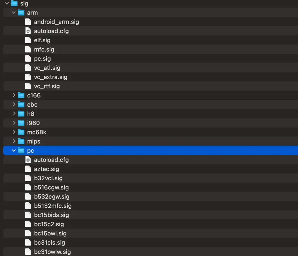 A separate signature file is provided for each compiler. FLIRT 采用多阶段识别策略,首先识别程序的入口点和编译器(startup signature file 这个特殊的签名文件决定判断 like exe.sig),然后根据编译器选择合适的签名库进行函数识别。