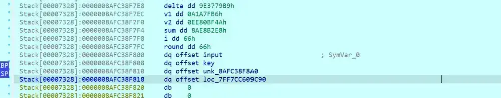 uint32_t v0 = v[0], v1 = v[1], sum = 0, delta = 0x9E3779B9;
