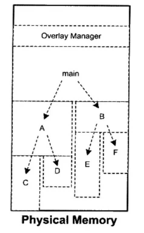 程序员通过编写覆盖管理器(Overlay Manager)来节省物理内存空间,不过要求程序解耦,模块化,能够最终组织成树状结构