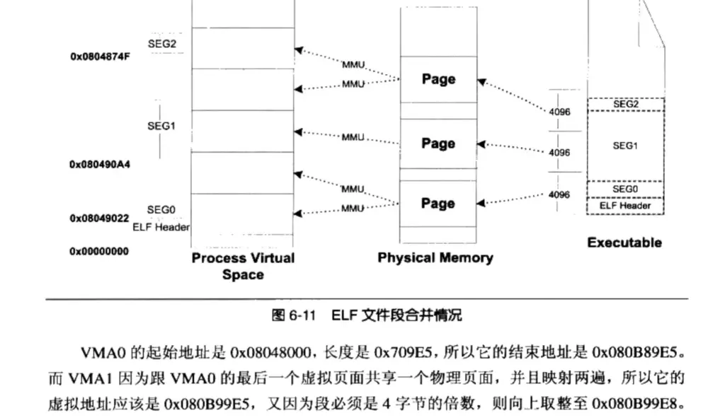 为了减少页的对齐产生的内存浪费,对于相同权限的段,将他们合并在一起当做一个段来进行映射,ELF 可执行文件将这称为 Segment ,在映射之后 VMA 就减少了