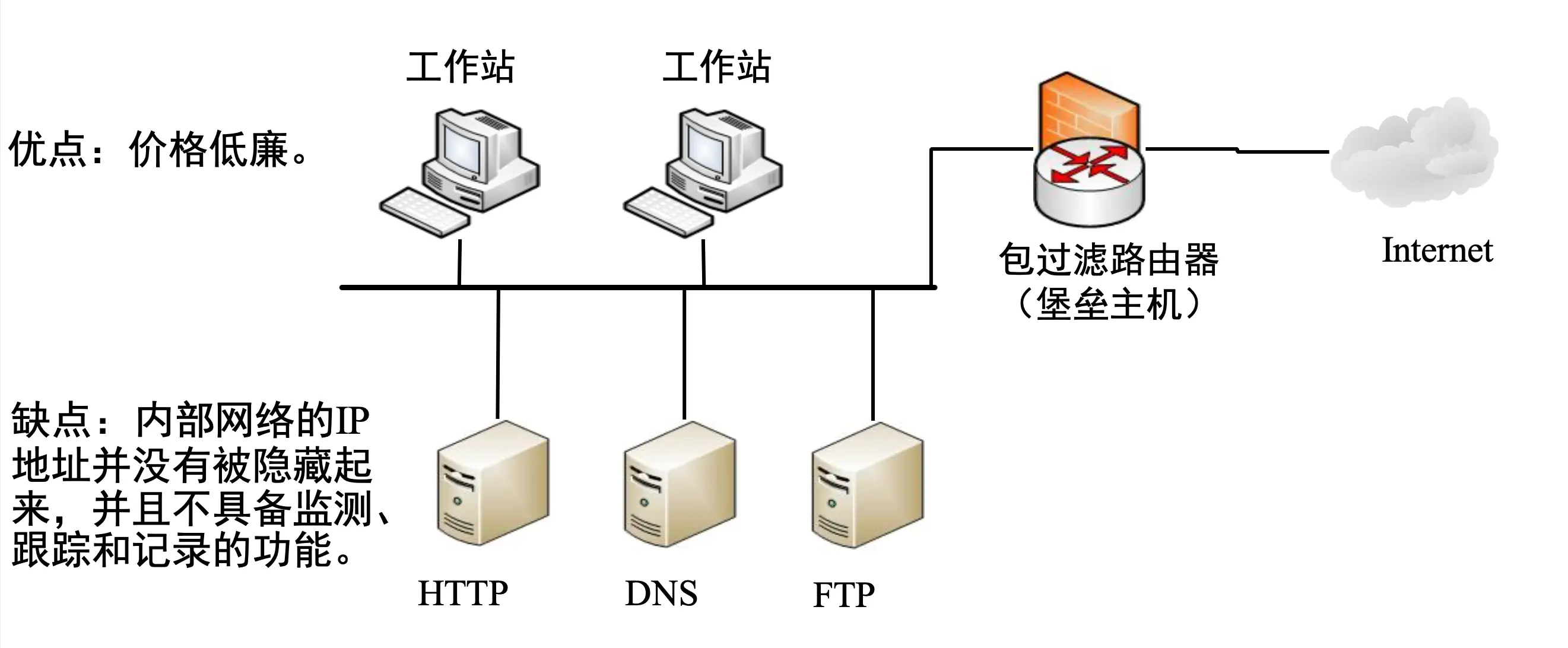 在内部网络和外部网络之间设置一个堡垒主机作为防火墙,所有进出内部网络的流量都必须经过堡垒主机。通常会允许一些代理服务以增强安全性