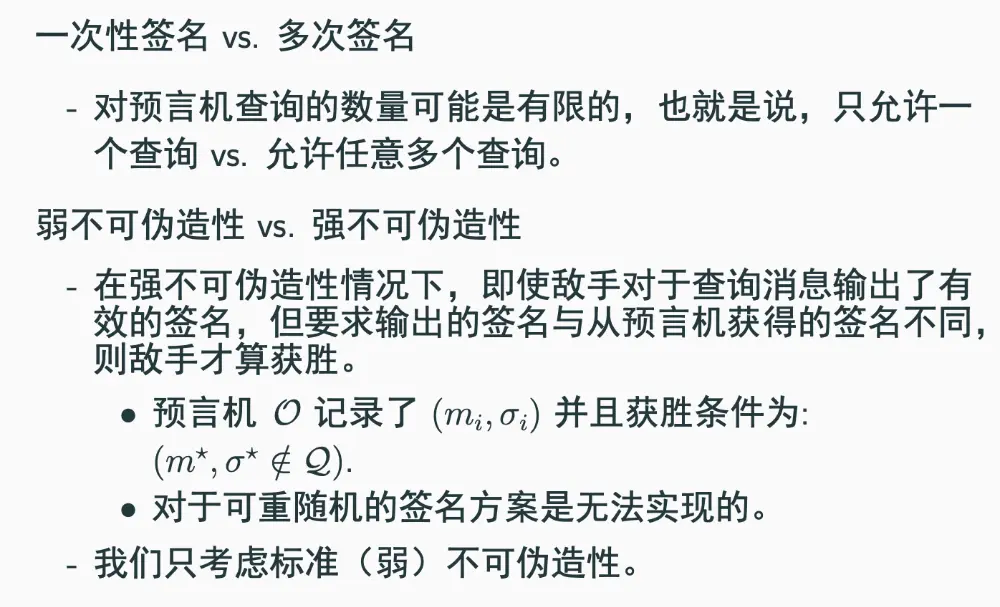 - 无条件伪造(Universal forgery,UF): 给定敌手一个目标,敌手需要为其输出有效的签名。