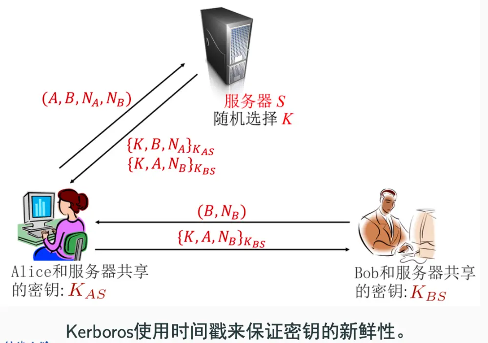 某一个可信服务器给用户分发密钥,它与每一个用户共享一个秘密密钥(长期密钥),并帮助他们彼此安全的共享会话密钥(eav 模型下)