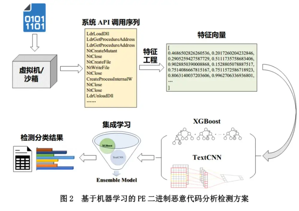- 得到 API 序列后对其进行特征工程 11,再用集成学习的方法对分类结果再选择最终得到分析检测结果,即得到是否为恶意代码和其具体类型