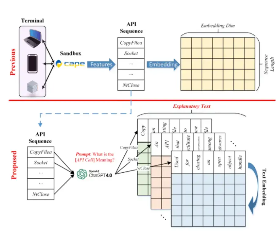 - 广东省智能信息处理重点实验室团队 34 通过引入大语言模型 GPT-4 辅助恶意代码的动态分析,提出了一种新的恶意代码检测方法。该方法首先利用 GPT-4 为 API 序列中的每个 API 调用生成解释文本,然后使用预训练模型 BERT 获取解释文本的表征,从而得到 API 序列的表征。接着,设计了基于 CNN 的检测网络从表征中提取和学习特征,实现恶意代码的分类。