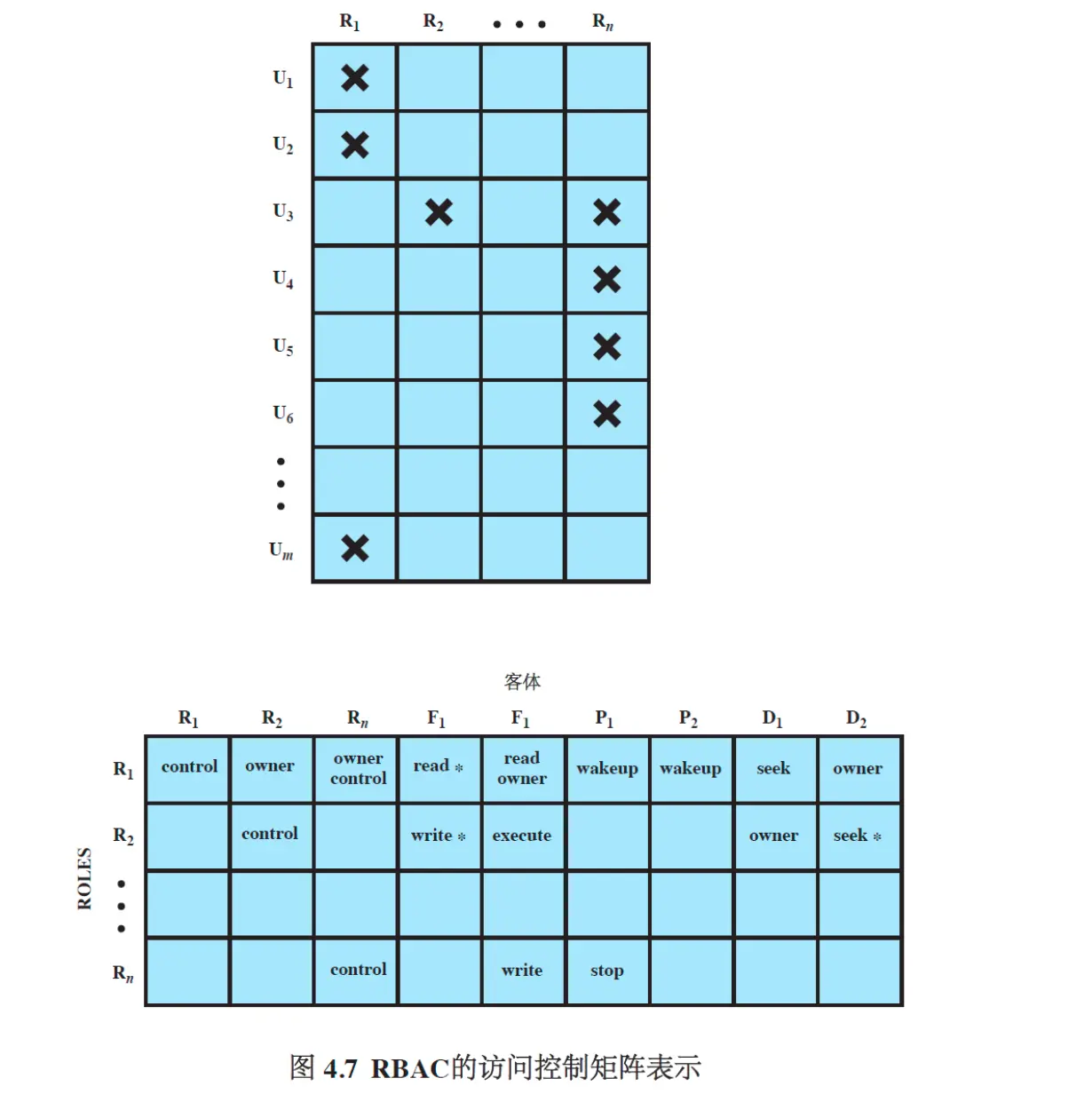 一个矩阵表示用户和角色之间的分配关系,另一个表示角色和权限之间的对应关系。
