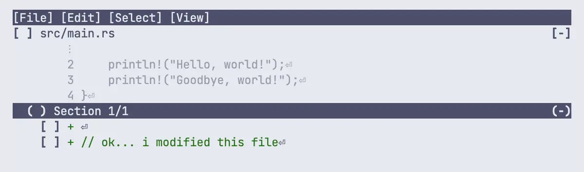 但我们也能实现类似 git add -p && git commit --amend 的效果,只将文件的部分改动加入提交。这绝对会让你大开眼界。
