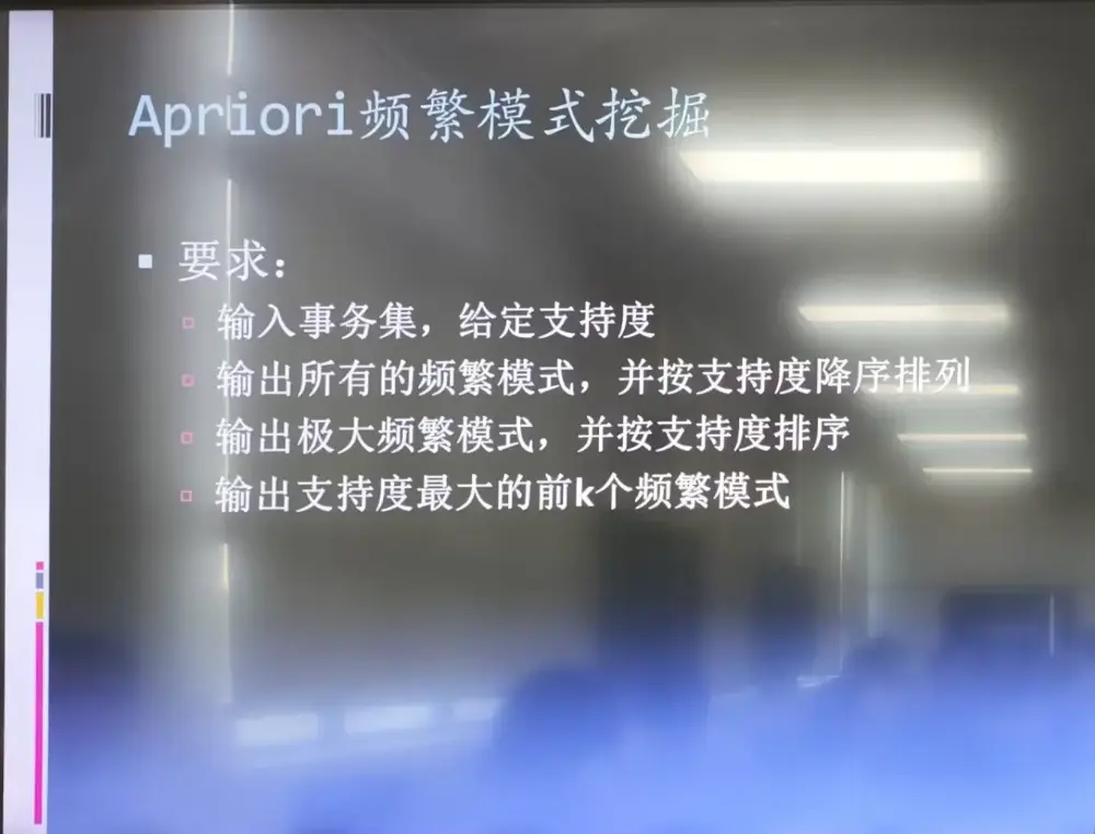 本实验旨在实现并验证频繁模式挖掘算法中的 Apriori 算法,主要任务是通过设定最小支持度和置信度参数,从数据集中挖掘频繁项集和关联规则。频繁模式挖掘是一种在大数据集或事务数据库中发现常见模式的技术。它被广泛应用于市场篮子分析、推荐系统和其他关联规则挖掘的领域。