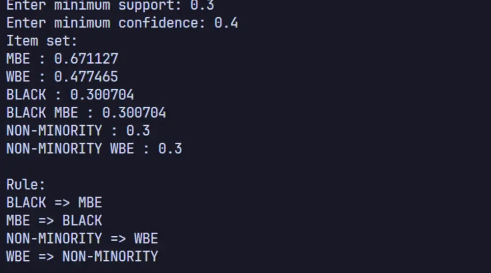 get_item_set_tran_list:从输入文件中读取事务数据,将其转换为项集列表和事务列表,为后续挖掘做准备。itemset_with_min_support:通过支持度过滤项集,保留满足最小支持度的项集。join_set:将不同频繁项集组合为更大项集,以便进行进一步的支持度检测。generate_subsets和get_subsets:用于生成项集的所有非空子集,为关联规则生成提供支持。run_apriori:主要算法执行函数,调用各个子函数完成频繁项集的挖掘,并生成满足最小置信度的关联规则。