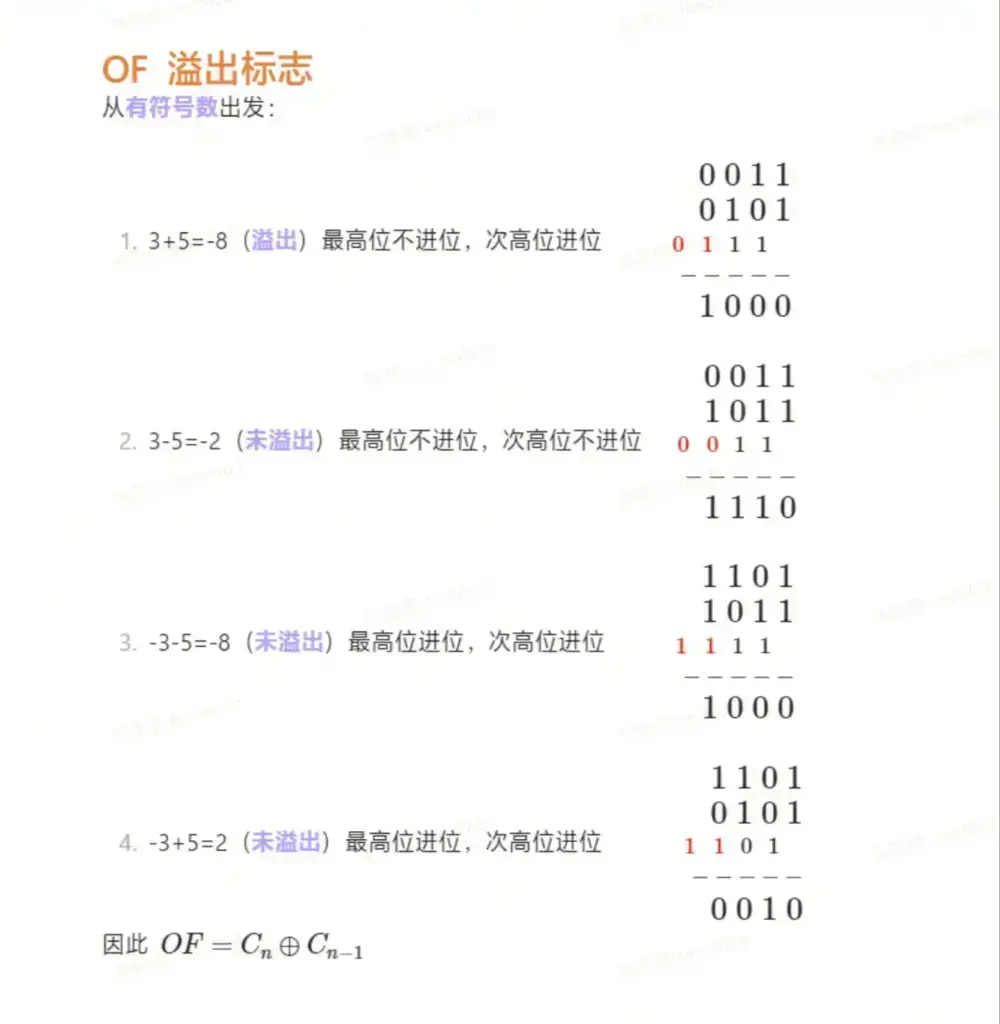 异号数相加,必然不溢出,OF=0;同号有符号数相加,若结果与它们符号不同,则 OF=1,否则 OF=0