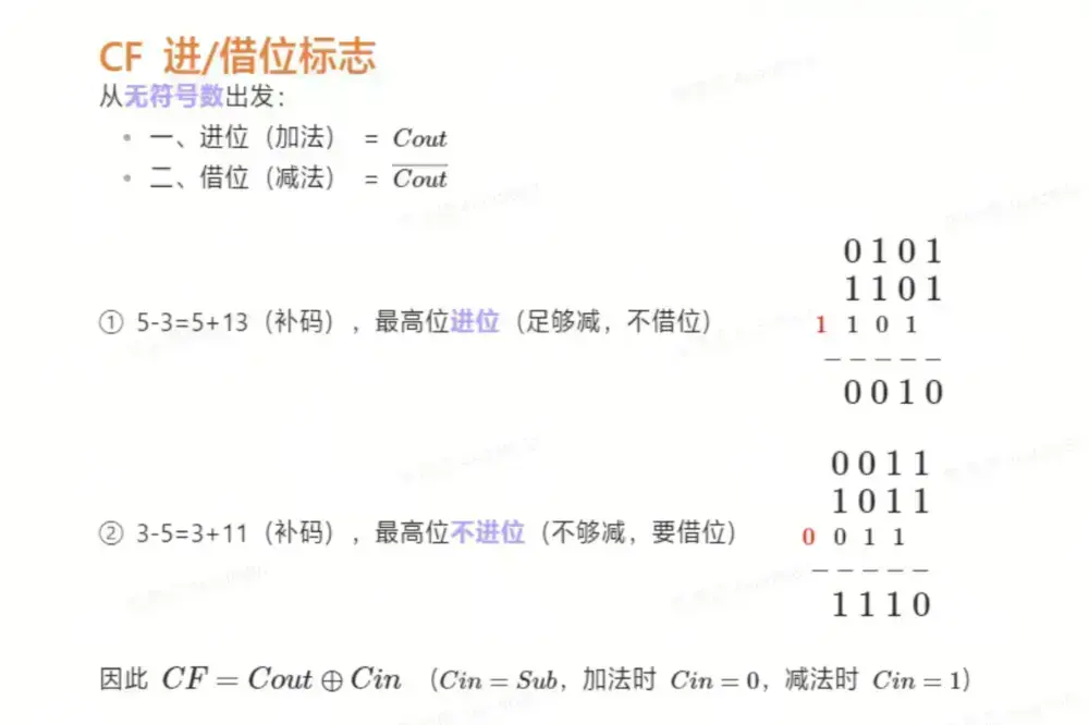 CF: 进位标志位。在无符号运算时,记录了运算结果的最高有效位向更高位的进位值或从更高位借位,产生进位或借位时 CF=1,否则 CF=0;