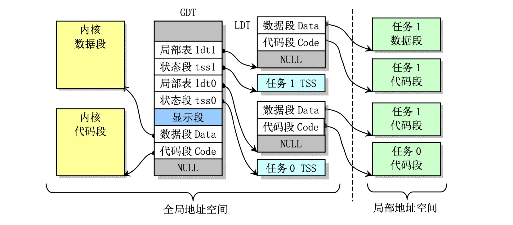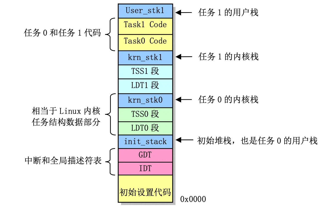 - 首先利用 ROM 的 BIOS 中断 int 0x13 把软盘中的 head 代码读入到内存 0x10000,然后再把这段代码移动到内存 0 开始,最后设置设置控制寄存器 CR0 中的开启保护运行模式标志,并跳转到内存 0 处开始执行 head 代码