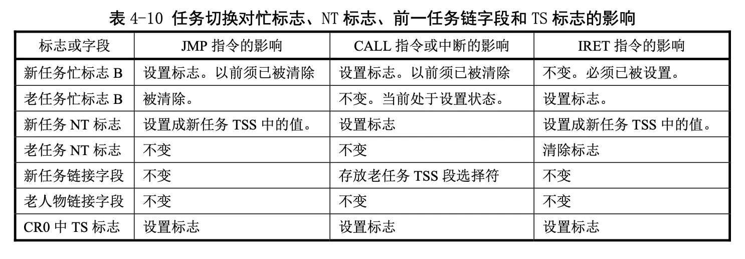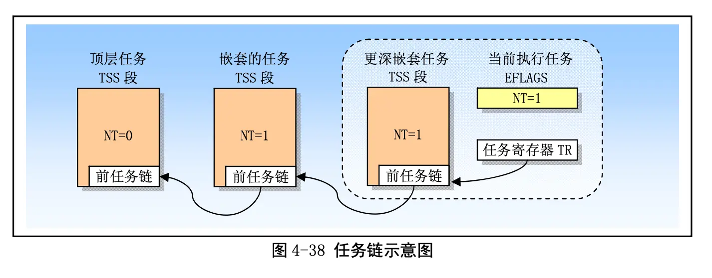 EFLAGS 中的 NT 标志表示当前执行任务是否嵌套在另一个任务中执行,并且当前任务连接字段中存放前一个任务的 TSS