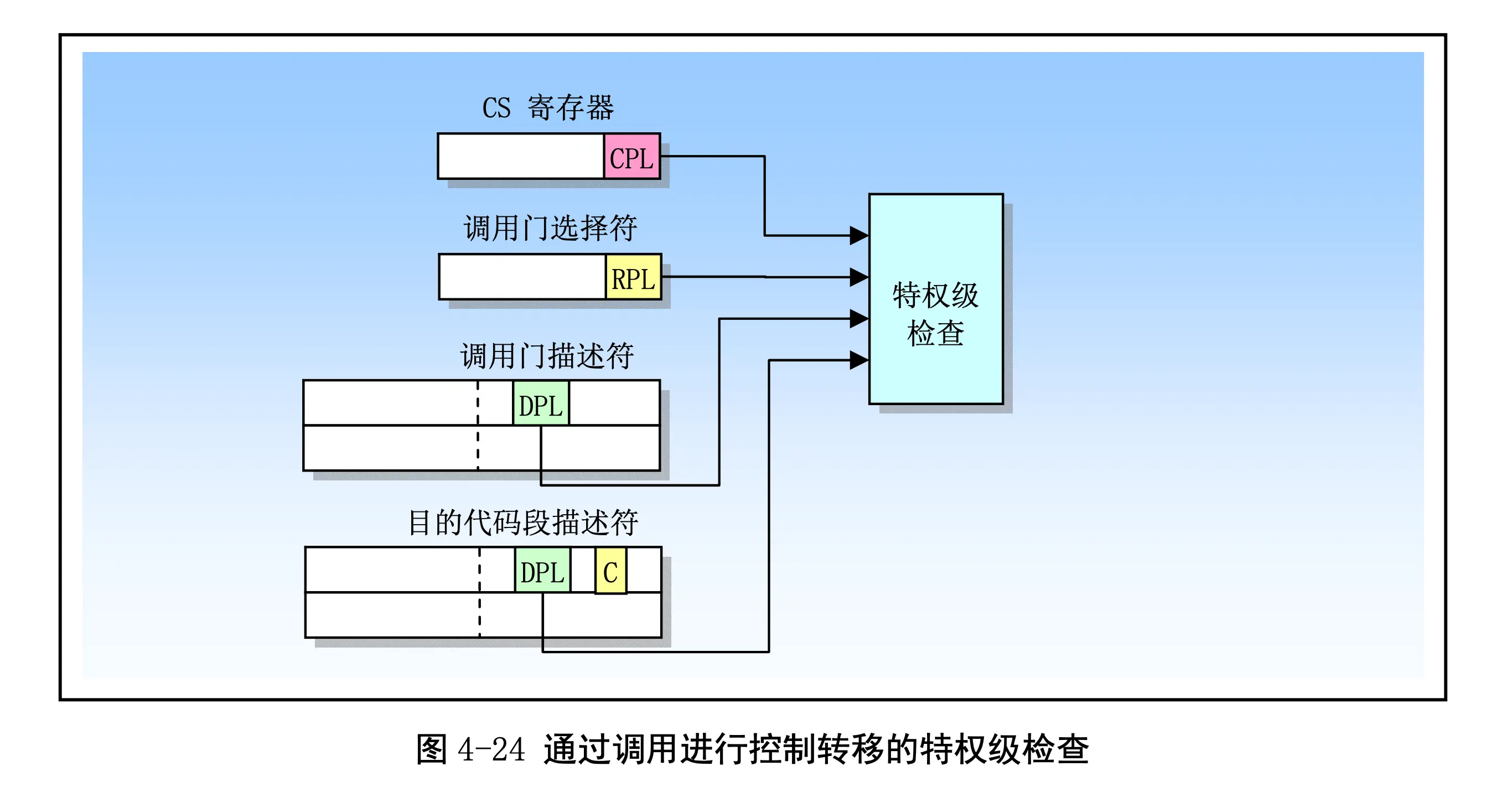 - 检查 DS,ES,FS,GS 内容,如果其中有指向 DPL 小于新 CPL 的段,CPU 会用 NULL 选择符加载这个段寄存器(越权了)(一致代码除外)