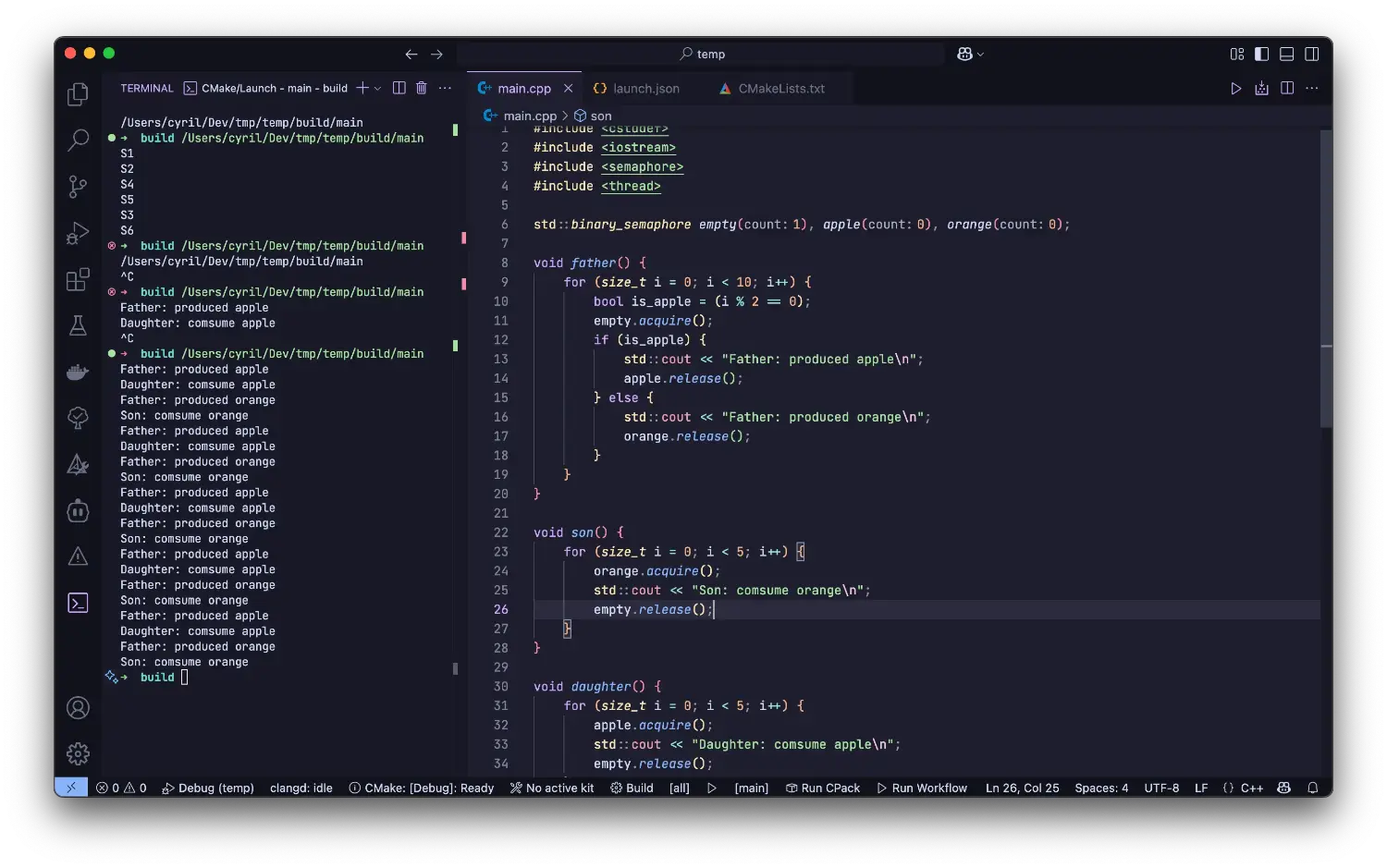 std::cout << "Father: produced apple\n";