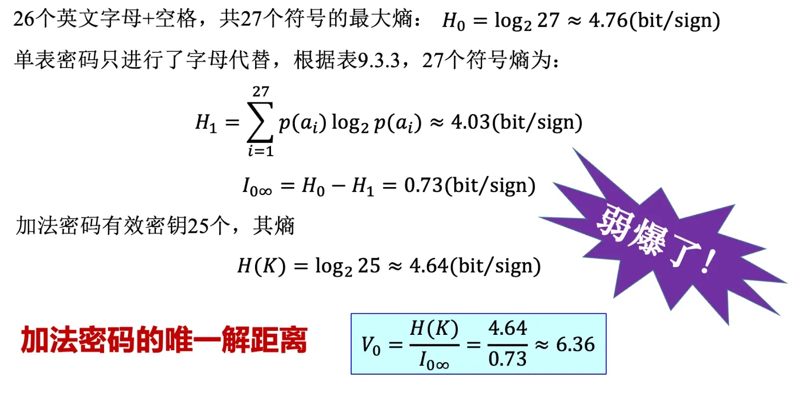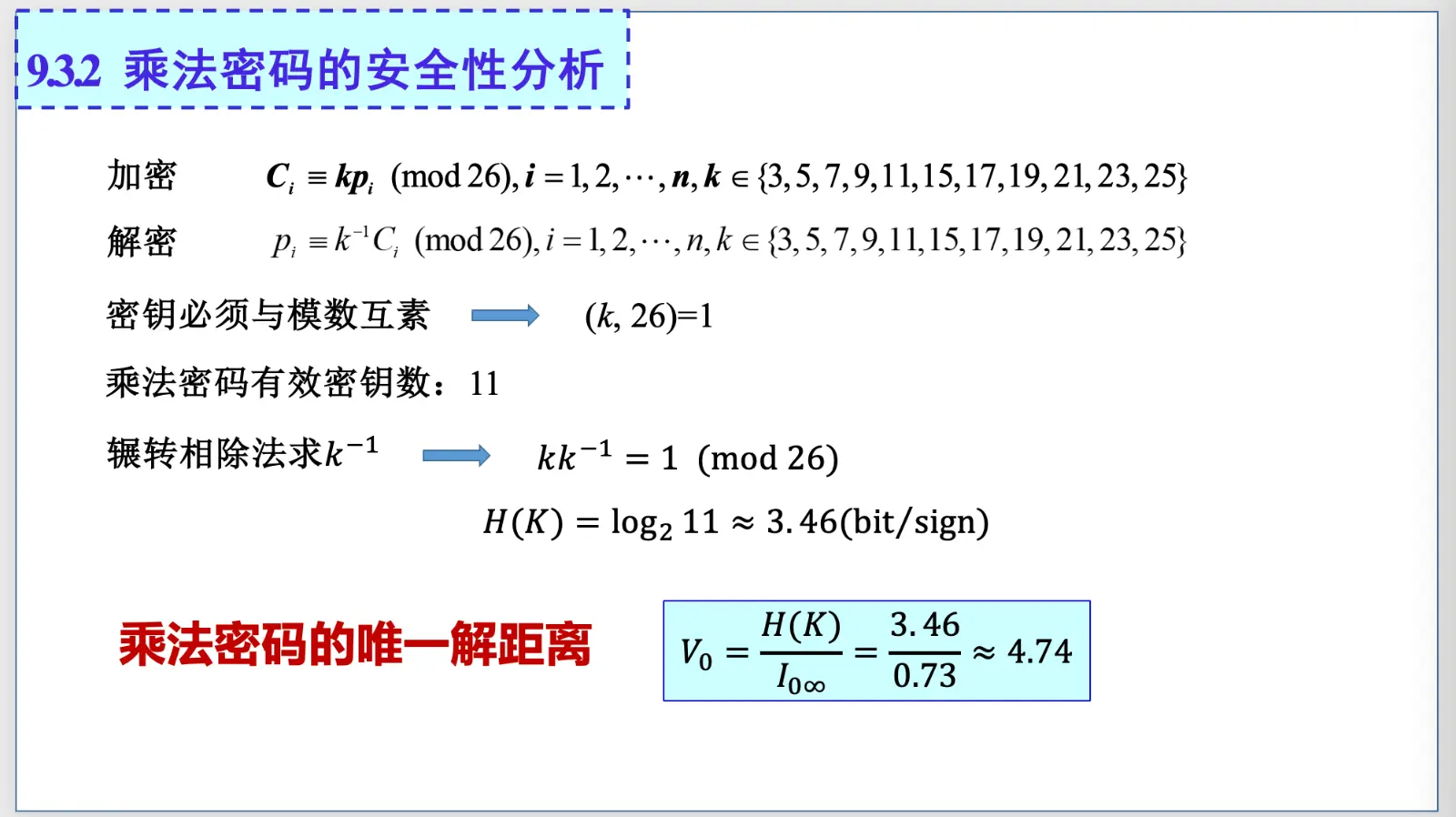 唯一解距离指攻击者需要收集多少长度的密文 C,才能够唯一的确定出加密所使用的密钥 K。它是一个理论下界,达到这个长度的密文,理论上密钥的“不确定性”会降到最低,只有一个密钥才能够将密文解密成有意义的明文。但这并不意味着攻击者就一定能够攻破密码,因为这个只是基于统计的推测