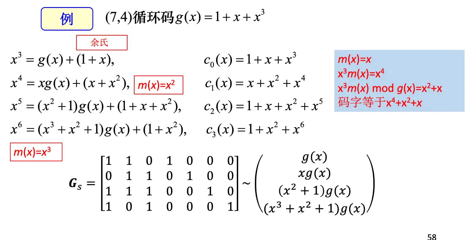 虽然生成方式变了,但是通过加上余数,最后的码字还是到 生成出来的理想里来了,拥有了循环码的性质