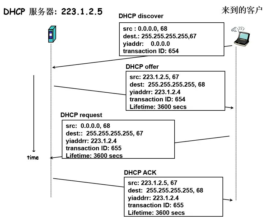 DHCP discover 查找 DHCP 服务器。(链路层广播)DHCP offer 消息响应。DHCP request。若有多个 DHCP 服务器响应,选择其中一个进行请求。DHCP ACK。