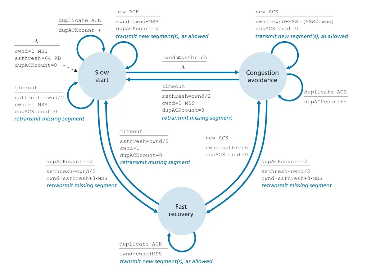 - 快速恢复: 收到了 3 个冗余 ACK,当前的 ssthresh 的值设置为当前 cwnd 的一半,将 cwnd 设置为(更新后的)ssthresh+ 3MSS(cwnd 减半加 3MSS),立即发送