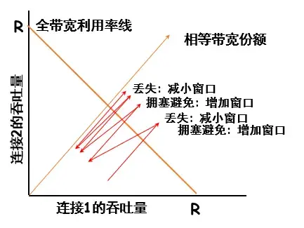 - 图中每一个点的横纵坐标表示两个连接的带宽利用率,它们的和是一定的。从红色线起点出发,沿着红色路径移动,最终会趋近于 y=x 所在的直线,即达到公平。